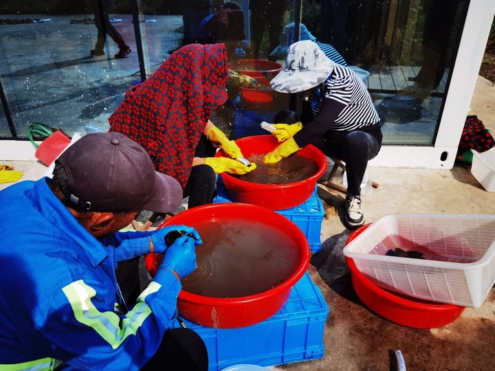 村民协助考古人员清洗发掘出的碎陶片。记者 朱旭东 摄