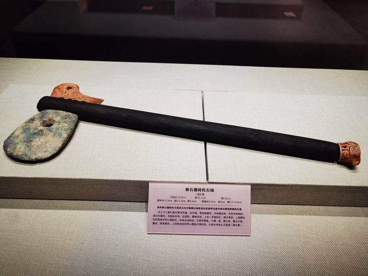 石钺及其饰件(木柄为后加)。记者 朱旭东 摄