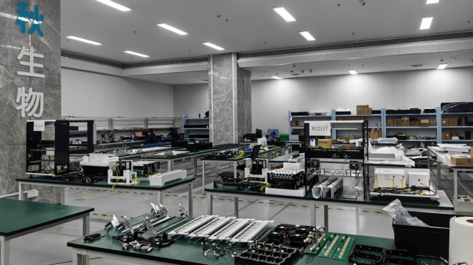 走进卡秋(江苏)生物科技有限公司,一排排约1立方米大小的木质箱体整齐排列,箱体标注为“全自动免疫组化染色仪”,侧面配有彩色触摸屏,内部机械臂与染色部件清晰可见,下方则用于存放试剂与收集废液。