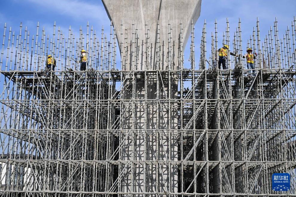 2月3日,中铁建城通公司工人进行盘扣支架搭设(无人机照片)。