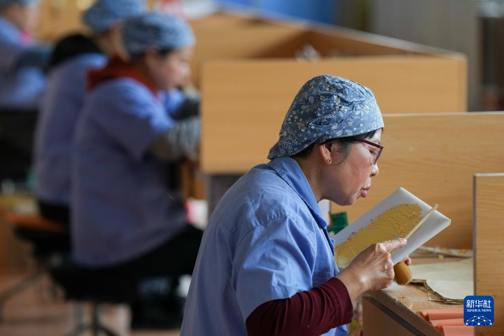 在南京金陵金箔集团股份有限公司,工人使用鹅毛将打制好的金箔从乌金纸中移到毛胎纸内(2月10日摄)。