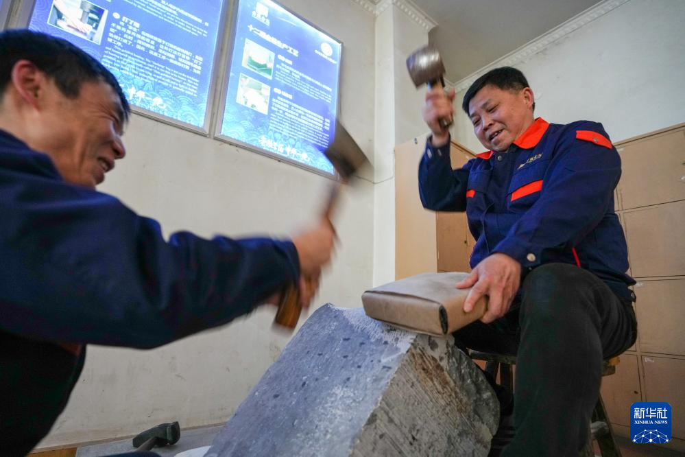 在南京金陵金箔集团股份有限公司,国家级非物质文化遗产南京金箔锻制技艺代表性传承人葛才金(右)和团队成员在进行金箔制作“打了细”环节展演(2月9日摄)。