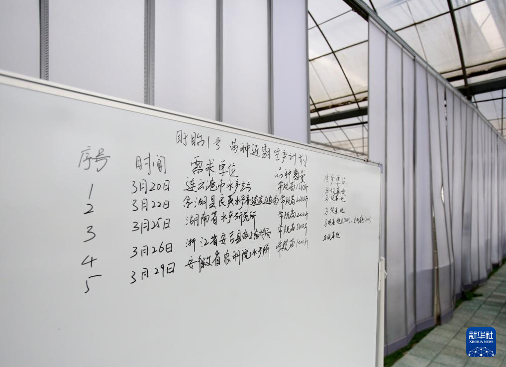 这是在江苏省现代农业(盱眙龙虾)全产业链标准化示范基地的育苗车间外拍摄的苗种近期生产计划(3月27日摄)。