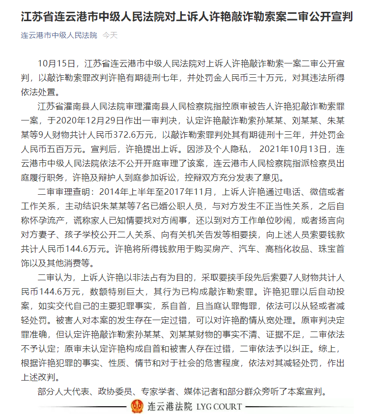 10月15日,江苏省连云港市中级人民法院对上诉人许艳敲诈勒索一案二审公开宣判,以敲诈勒索罪改判许艳有期徒刑七年,并处罚金人民币三十万元,对其违法所得依法处置。