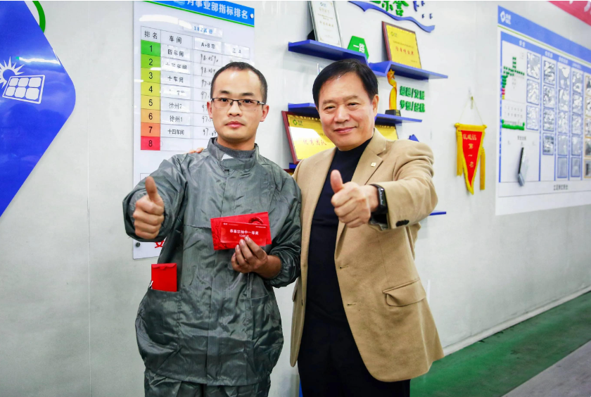 1月22日,农历癸卯兔年正月初一上午,冒着蒙蒙细雨,协鑫集团董事长朱共山来到苏州协鑫光伏科技有限公司,为春节期间默默坚守一线、舍小家为大家的协鑫奋斗者带来新春的祝福,并与大家共话企业未来发展蓝图。朱共山径直来到车间,向坚守岗位的员工一一发放现金红包等“新春大礼包”。