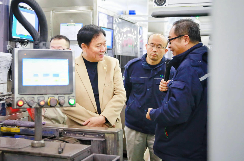在车间现场,一派热火朝天的生产景象。“新年好,大家辛苦了!”朱共山问候一线工作者,并走进车间观看粘胶、切片、清洗各个工序,了解生产现场情况,为现场员工送上新春祝福。