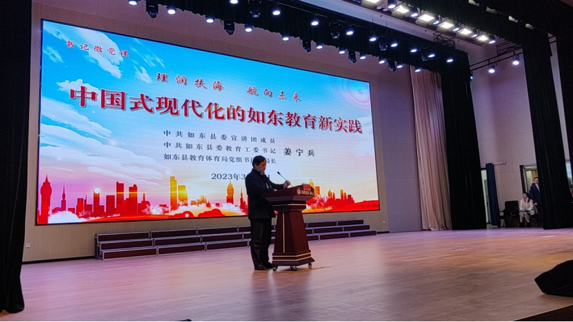 3月16日,在江苏省如东县教体系统“理润扶海·航向未来”党员冬训特色示范活动中,江苏省如东县委宣讲团成员,县委教育工委书记,县教体局党组书记、局长姜宁兵执教党课《中国式现代化的如东教育新实践》开启第一篇章《思想引航》,引导大家深刻理解和掌握新思想,明确如东教育发展新蓝图和新实践方向。