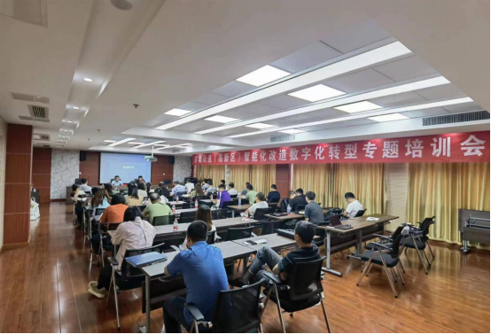 培训以现场观摩和专题授课的形式开展。专题授课前,园区40多家重点企业负责人、高新区企业服务部相关负责人一行走访观摩了泰达纺织、华脉光电、华利精密齿轮三家企业。大家边观摩边听取“智改数转”情况介绍,认真学习相关先进经验和做法。