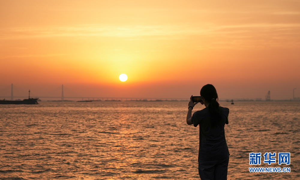 市民在江边拍摄落日