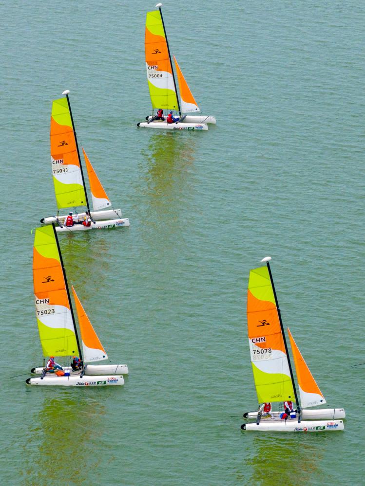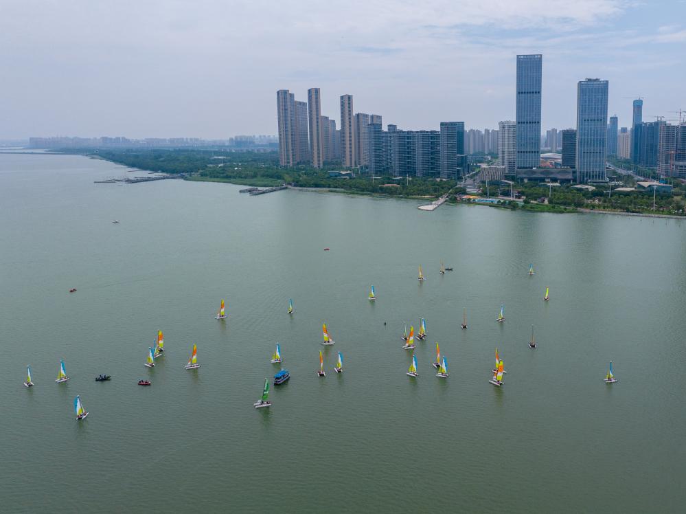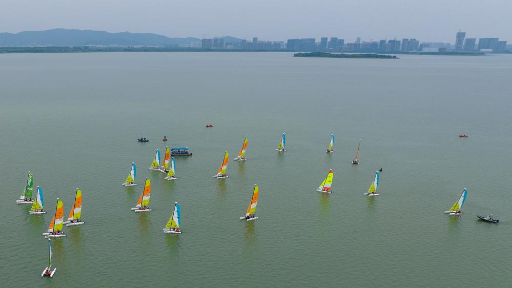 7月15日,2023中国家庭帆船赛苏州吴江东太湖站扬帆启航,近40支参赛队伍竞速东太湖,展开为期2天的水上航行之旅。据介绍,本站家帆赛吸引了来自全国各地的帆船爱好者参加,他们以家庭为单位,共享水上运动带来的快乐。