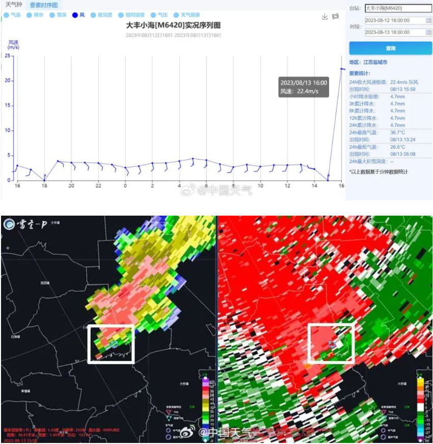 另据中国气象局气象探测中心消息,雷圣-P雷达监测显示,15时55分盐城大丰区小海镇识别到中气旋和高架TVS,雷达回波有钩状回波特征和弱回波区,1.6km高度有较大速度切变,最大中气旋旋转速度为16.25米/秒,在15时58分地面自动站(大丰小海)风速为22.4米/秒。