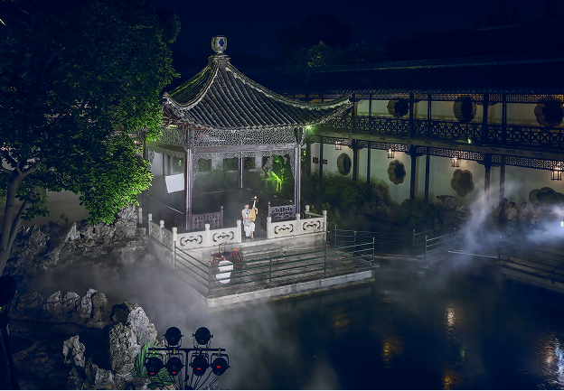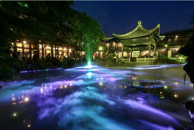 据介绍,这是何园打造的六个IP主题夜游夜演景区,华灯初上的何园,好似步入了一个光影纷呈的魅力之夜。园中游人如织,无不为这流光溢彩的风景而驻足。尤其是何园推出的“寄啸风华”夜演,令游客叹为观止,惊艳万分。何园相关负责人介绍,“寄啸风华”夜演,以诗学书画意境为蓝本,由园林做主角,借光、音等非固体媒介,围绕通感体验,重塑东方造园美学中的空间诗学。