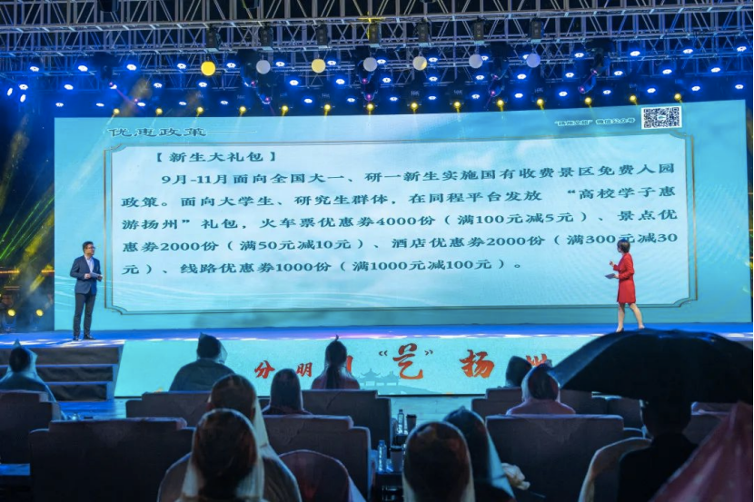 活动现场为全国高校新生送上文旅大礼包:9月-11月,面向全国大一、研一新生实施国有收费景区日间免费入园政策;面向大学生、研究生群体,在同程平台发放“高校学子惠游扬州”礼包,发放一批火车票、景点、酒店、线路优惠券。
