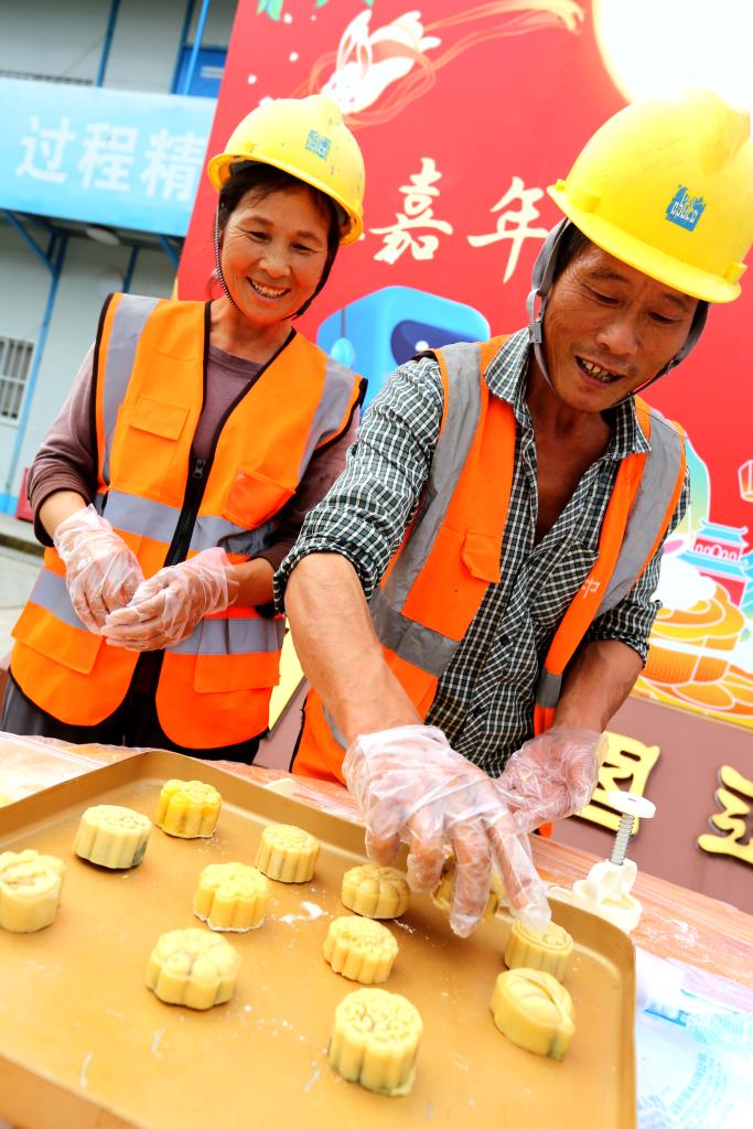 中建二局江苏分公司的建设者们在南京溧水G11项目部制作月饼(9月27日摄)。