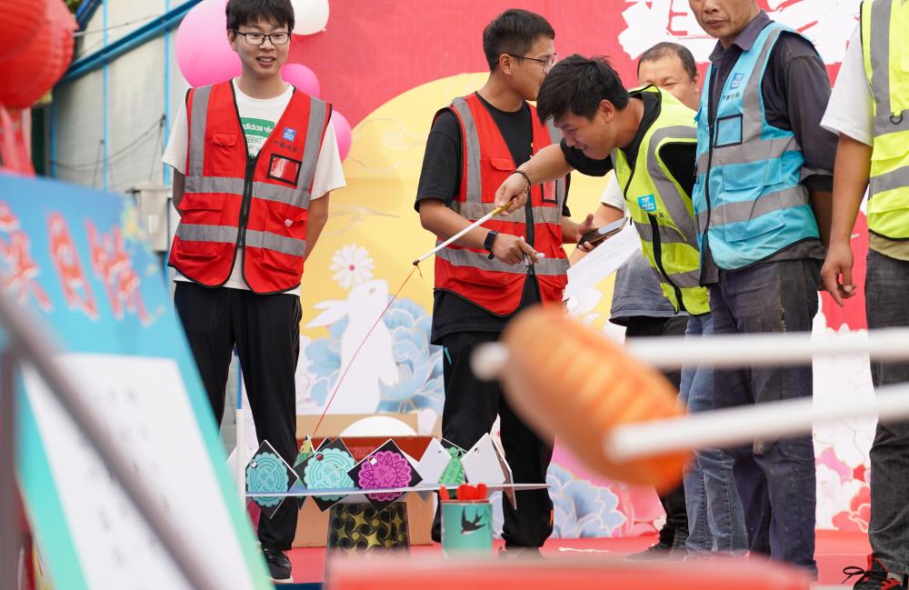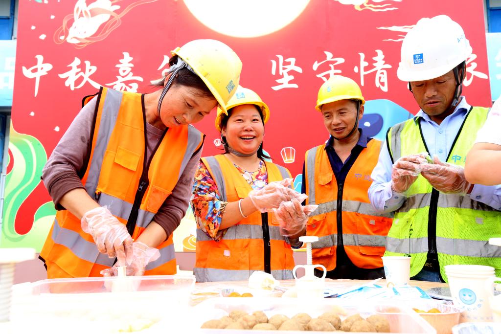 中秋佳节来临之际,江苏南京的建筑工地节日气氛浓厚,建设者们包月饼、做花灯、猜灯谜,以多种形式迎接中秋佳节。