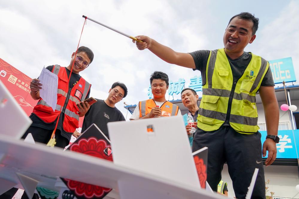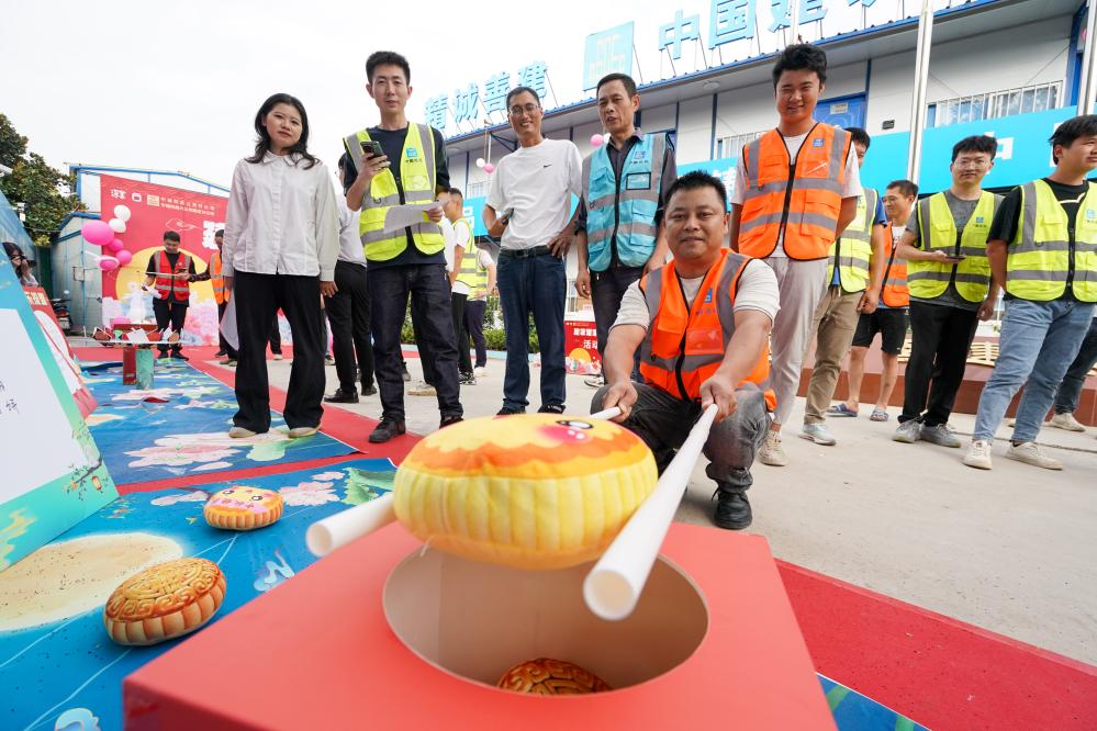 中建四局江苏分公司的建设者们在南京G111项目部进行游戏,迎接中秋佳节的到来(9月27日摄)。