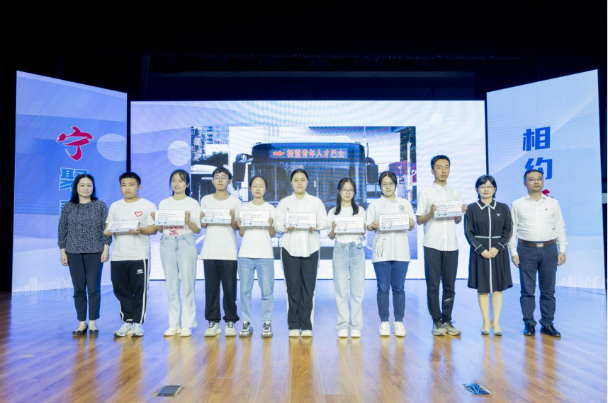 “青眼看栖霞”青年人才巴士正式启航,为大学新生代表颁发体验车票。