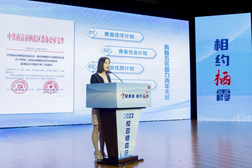 栖霞区委组织部进行青年人才政策推介,包括面向高层次创新创业青年人才项目给予最高450万元资助,青年人才创业“零成本”工位,以及全年提供不少于1万个就业岗位等务实举措,涵盖青年人才创新创业、招聘就业、项目申报、安居保障等服务事项。