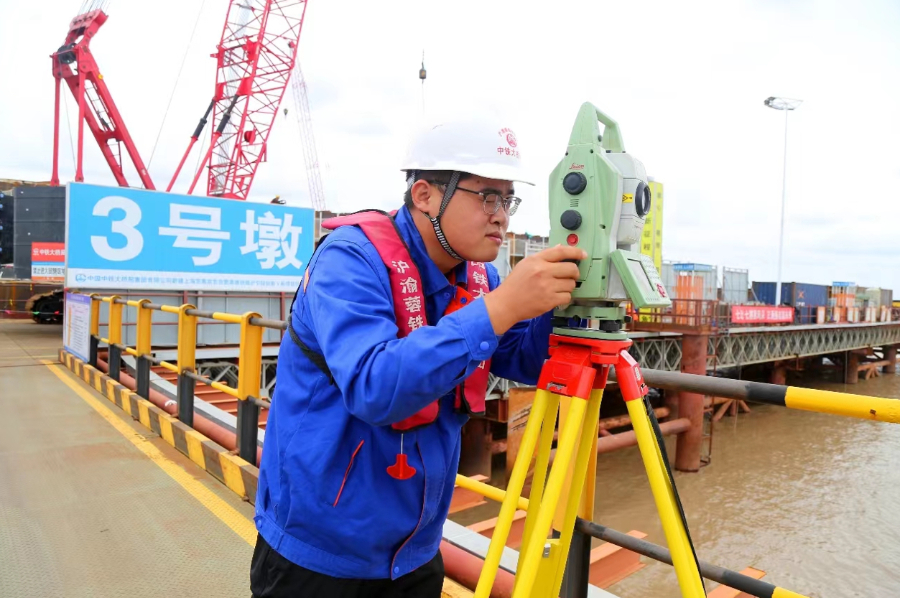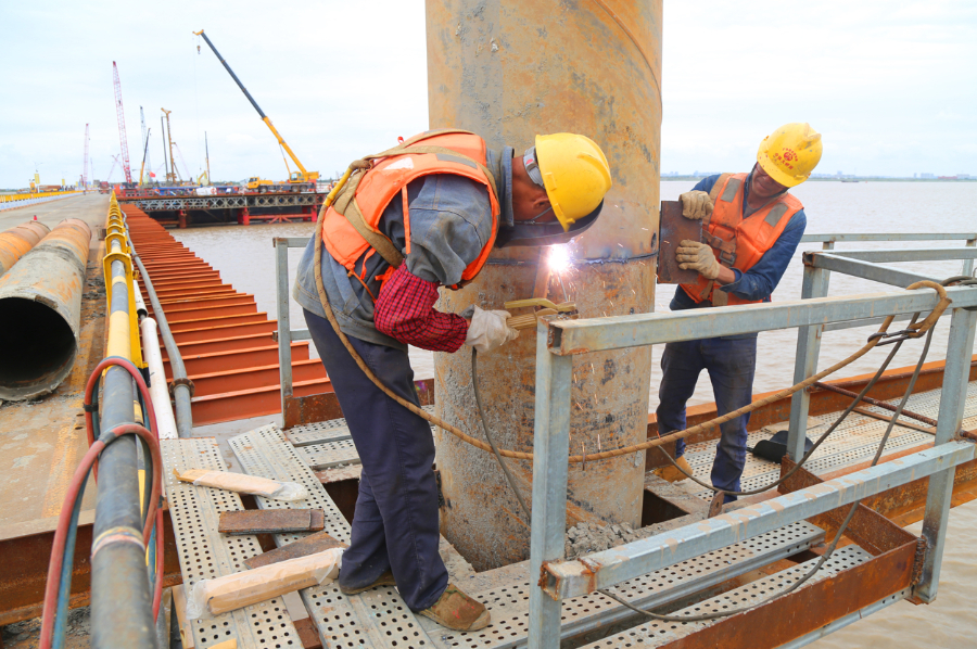 国庆中秋“双节”期间,中铁大桥局崇启公铁长江大桥项目施工现场,600余名建设者在保证质量和安全的前提下加快推进项目建设。