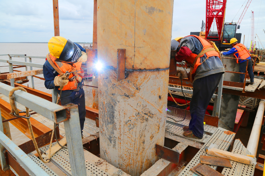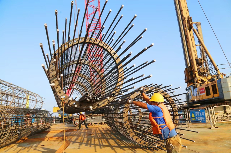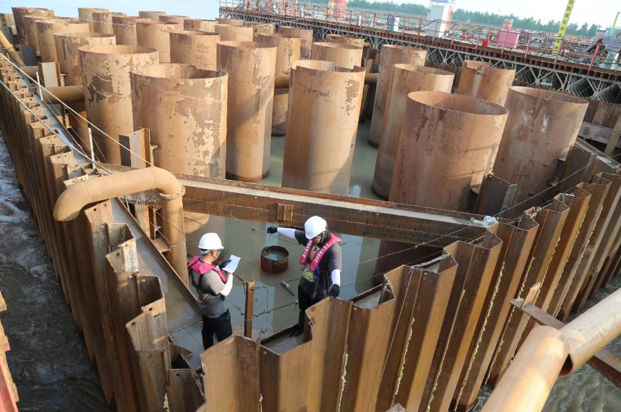 目前,崇启公铁长江大桥3号主墩四节钢围堰全部完成吊装;基础钻孔桩紧锣密鼓,崇启公铁长江大桥(一分部)水上钻孔桩414根,已经完成308根,陆地钻孔桩536根,已完成420根;崇明特大桥(一分部)钻孔桩2138根,已完成466根。