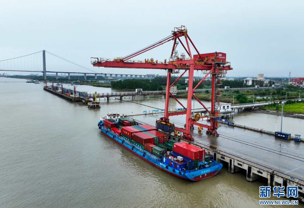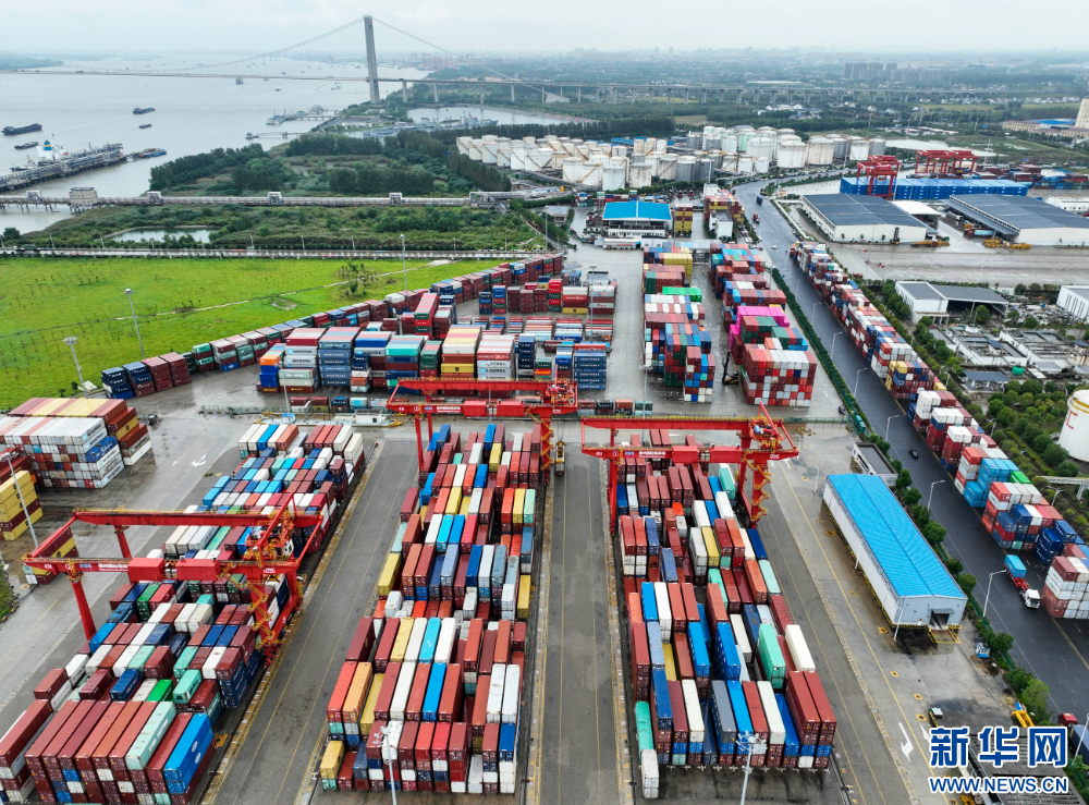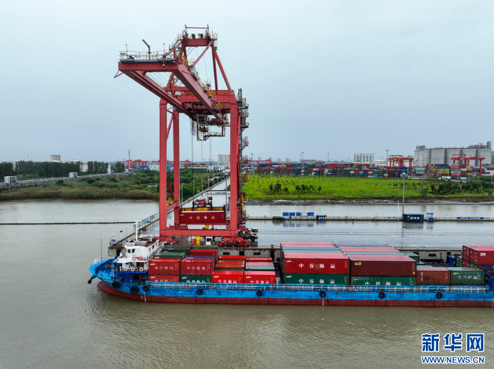 10月7日,中秋、国庆假期后的首个工作日,在江苏泰州港集装箱码头,集装箱运输船舶停靠在码头有序装卸货物,运载车辆来回穿梭,现场一派繁忙的生产景象。(沙芳如 报道员:顾继红 平波)
