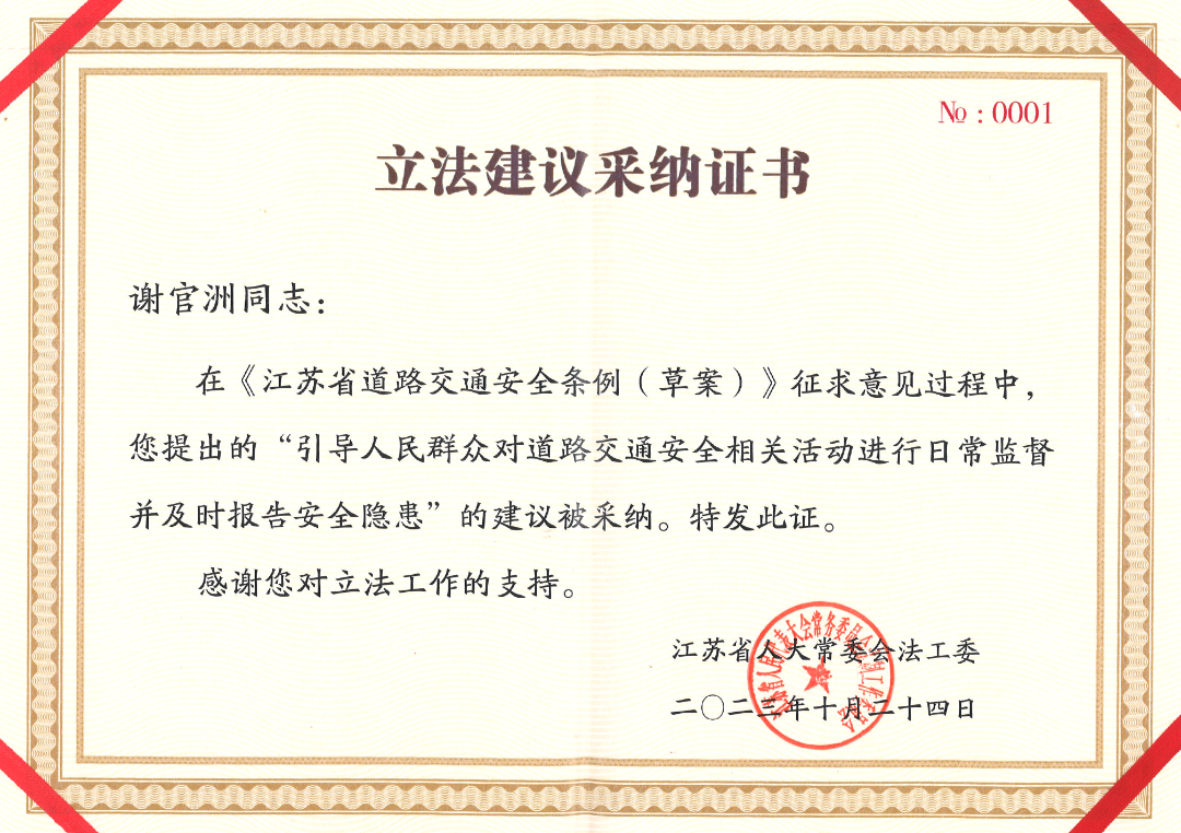 新修订的《江苏省道路交通安全条例》(以下简称条例)将于2024年施行。在立法调研和征求意见过程中,社会公众、人大代表、基层立法联系点、立法研究基地和专家等社会力量积极参与,提出了不少高质量的意见和建议,并被吸收采纳。10月24日,省人大常委会在南京举行《江苏省道路交通安全条例》立法建议采纳证书颁发仪式,向南京市民谢官洲、省人大代表张盼盼、省人大常委会基层立法联系点睢宁县人民法院、南京大学江苏省地方立法研究基地、专家菅从进分别颁发0001—0005号立法建议采纳证书,鼓励广大市民群众积极参与立法。