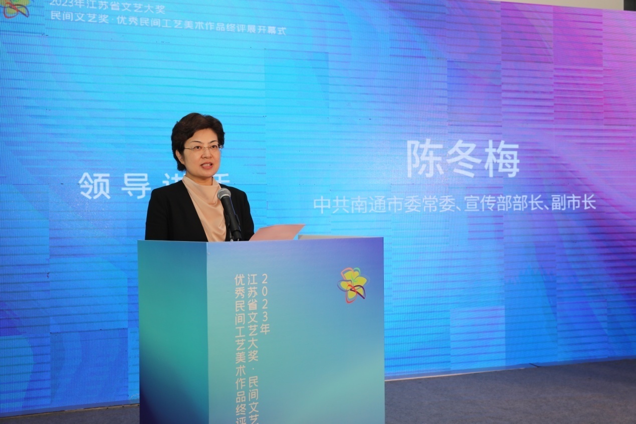 中共南通市委常委、宣传部部长、副市长陈冬梅向参加活动的艺术家们表示热烈祝贺。她说,近年来,南通市委市政府积极传承发展优秀传统文化,南通民间文艺持续迸发出蓬勃的生机和活力,呈现出百花齐放、欣欣向荣的生动景象,一共捧回蓝印花布等在内的14个中国民间文艺最高奖“山花奖”。陈冬梅表示,南通将以此为动力,持续推动江海特色文化城市建设,积极吸取全省各地民间艺术养分,大力发展优秀民间文艺,创作更多的文化艺术瑰宝,为建设社会主义文化强市和社会主义文化强国先行区贡献南通力量。