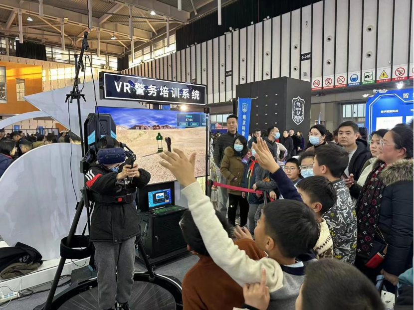 在智慧警务展台,VR警务实战培训系统受到了小朋友们的欢迎,纷纷排队体验。“这套系统利用虚拟现实技术模拟接处警、现场盘问、武器警械使用等实战场景,是一种更安全、更逼真、更高效的低成本训练方案。”现场工作人员介绍,目前这套系统已经在部分基层单位开始试用,在日常的训练中,警务人员只需要穿戴上这套设备,就能对警务执法过程中可能发生的各种场景进行还原、模拟训练,在降低训练难度和成本的同时,也能够提升训练效率,规范民警实战处置。
