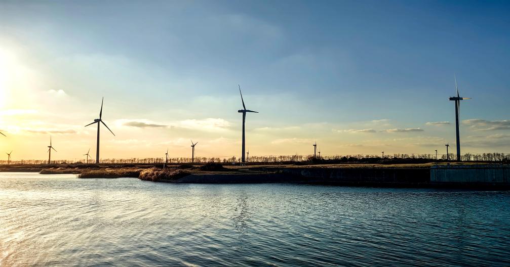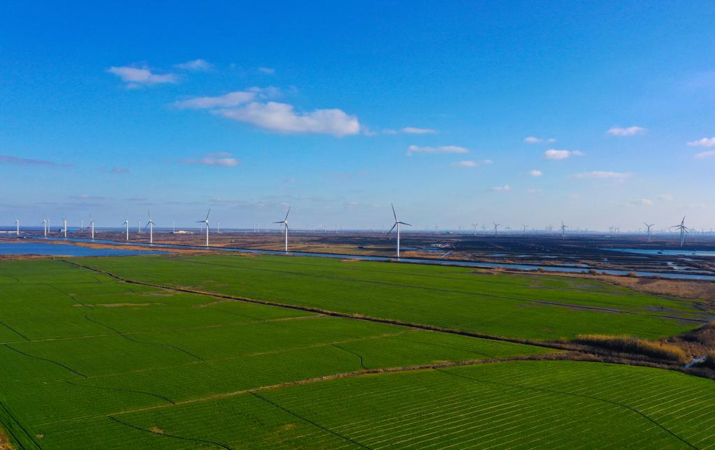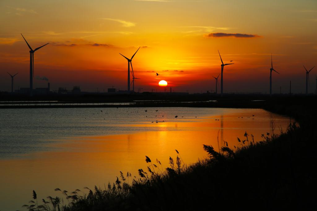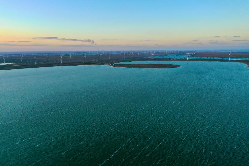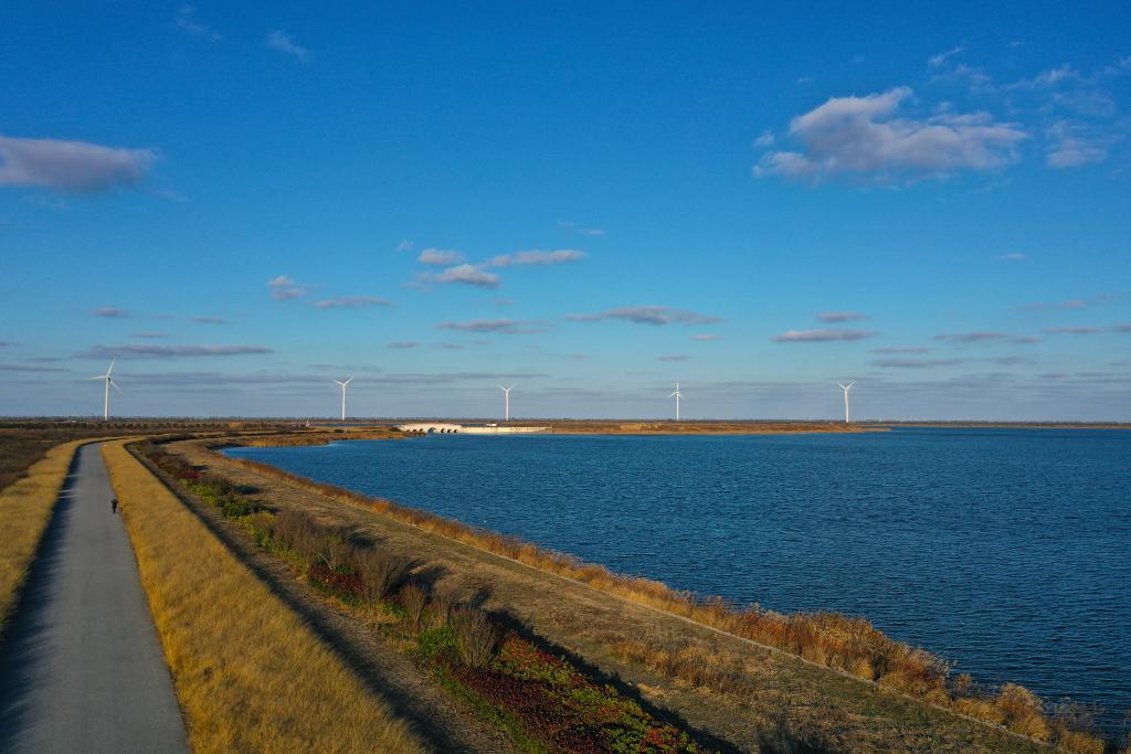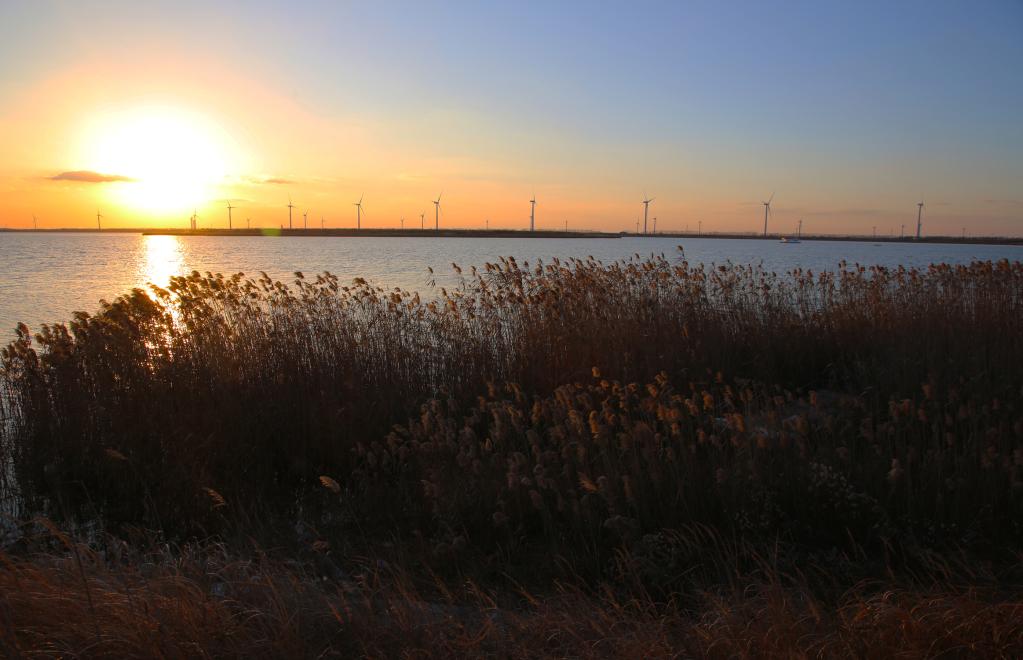 冬日的江苏如东东湖,碧波荡漾,芦苇摇曳,一排排风车与自然景观相映成趣,形成了一道亮丽的风景线。(摄影:顾华)
