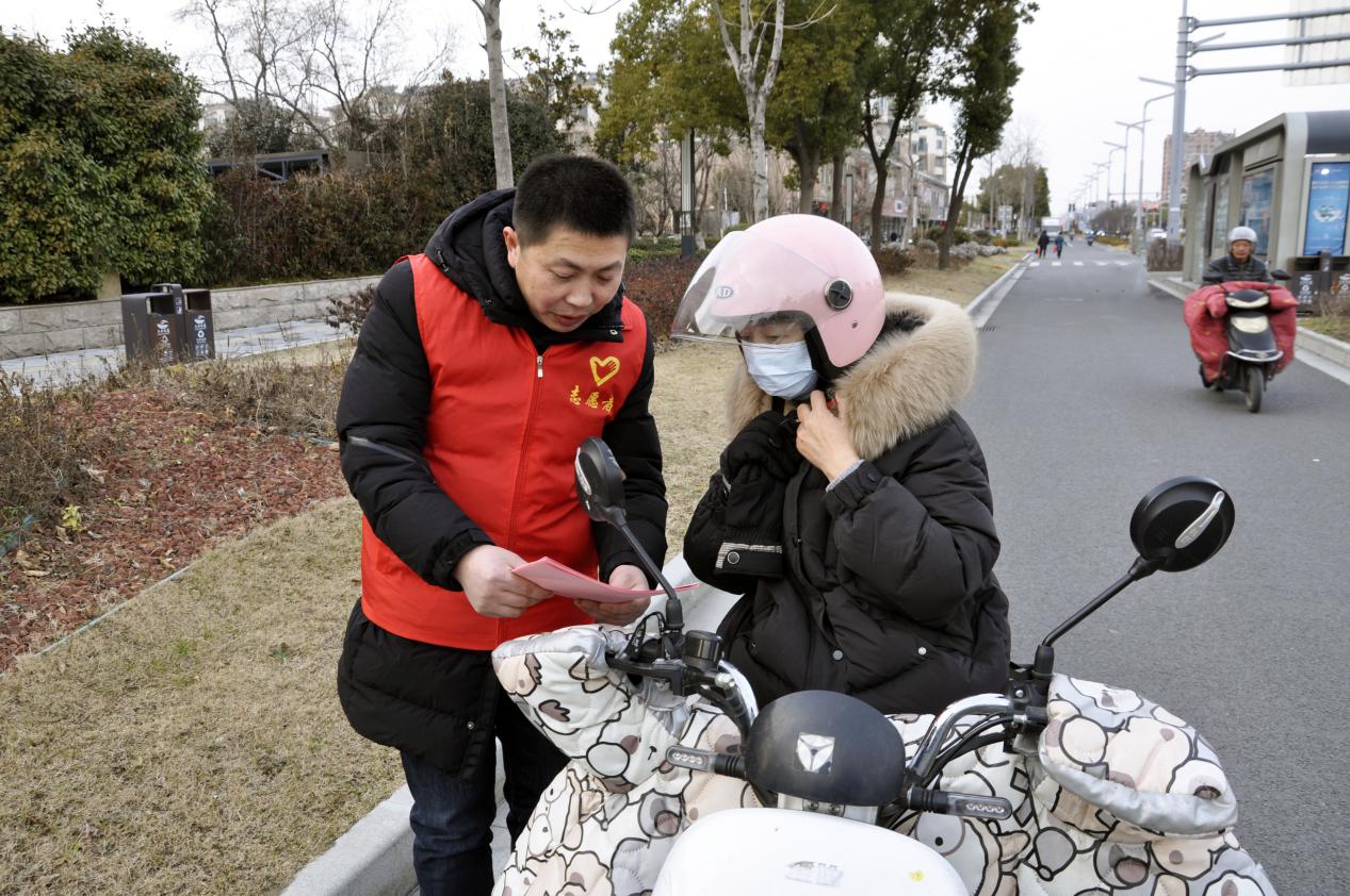 “请您注意,骑行电动车一定佩戴头盔,安全第一。”“您好,现在是红灯,请您在标识线外有序等候,注意安全。”党员志愿者正提醒过往群众根据“一盔一带”要求文明出行、有序通行。