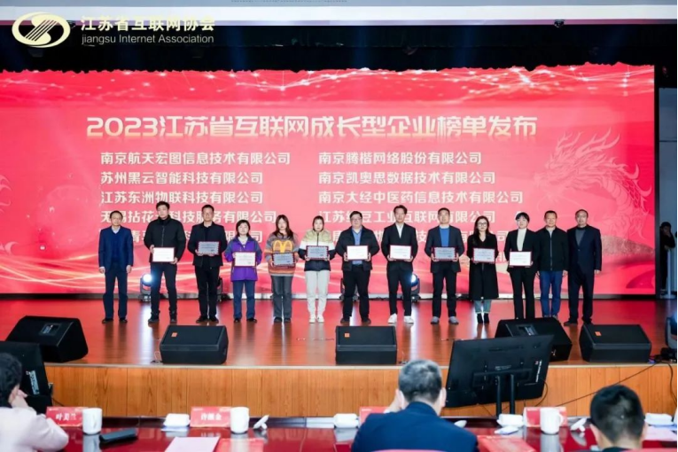 江苏省互联网协会副秘书长、江苏移动数据业务运营中心总经理单绍勇,江苏联通工会主席周斌、江苏电信政企客户部副总经理茆剑为2023江苏省互联网成长型榜单企业授牌。