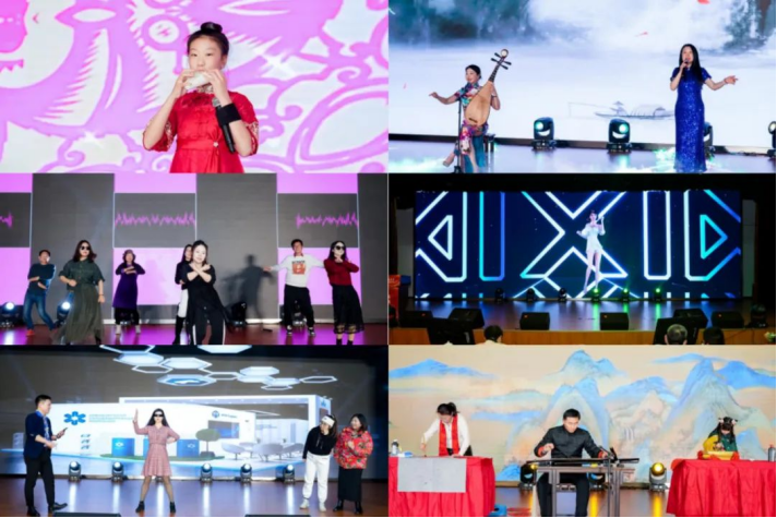 在汇演环节,瑞祥集团、微微一笑(南京)传媒、苏州金迅博、硅基智能、扬子人才网、协会理事单位代表联合表演节目《快乐颂》《苏货直播-我们的真情告白》《声声慢》《数字人歌舞串烧》以及扬州古琴《流水》+书法表演和科目三歌舞串烧《当遇见互联网》。(李正豪)