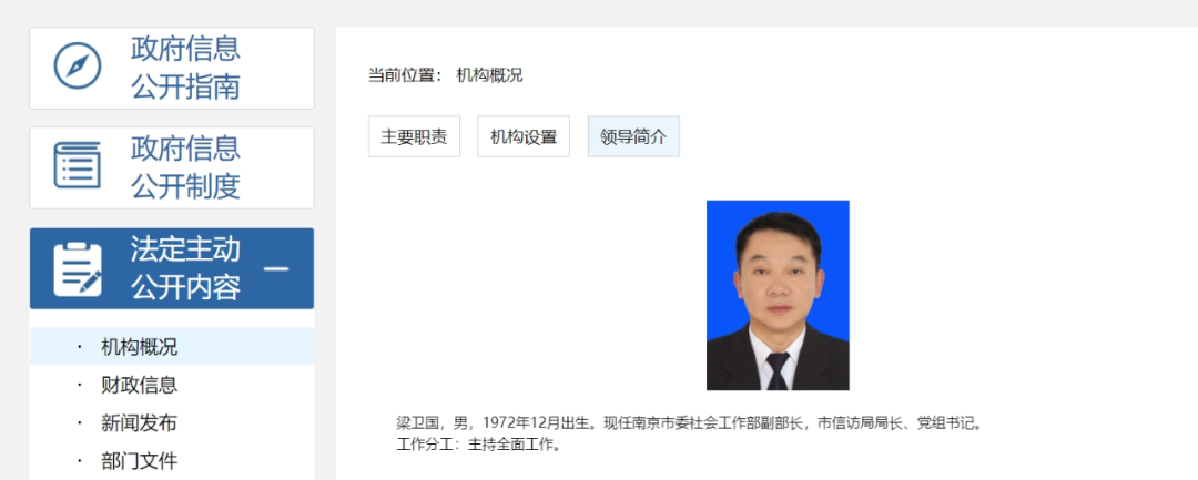记者还注意到,南京市委社会工作部已亮相。南京市信访局官网信息显示,梁卫国已任南京市委社会工作部副部长,市信访局局长、党组书记。