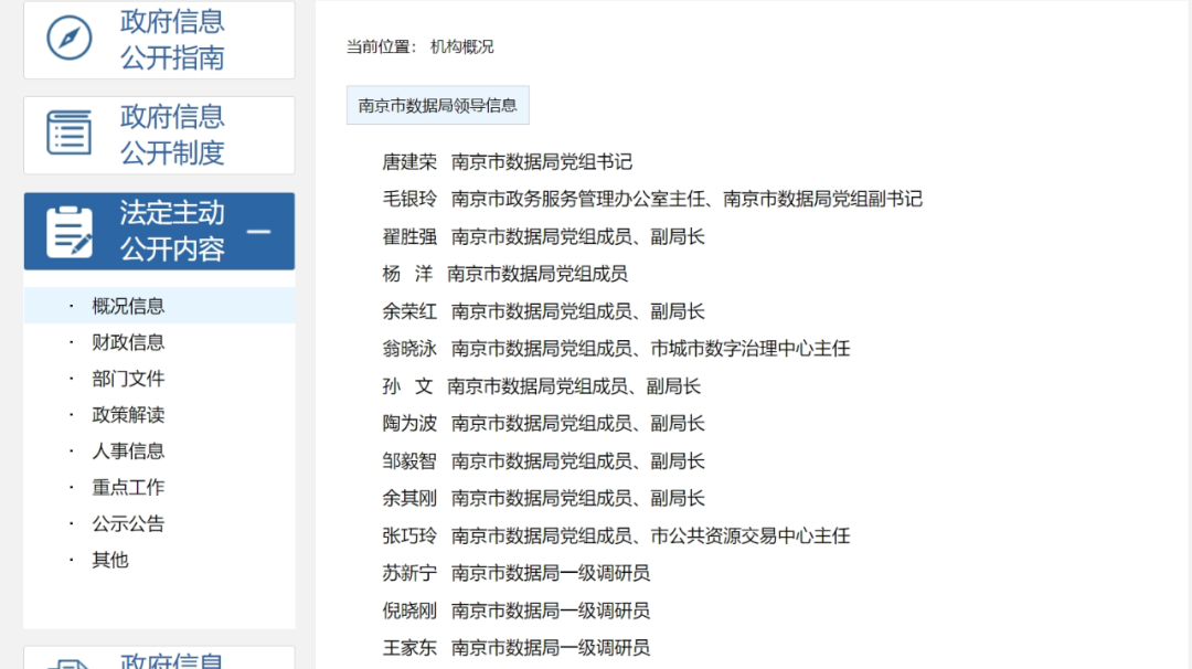 日前,南京市数据局(南京市政务服务管理办公室)官方网站已上线,沿用以前的南京市政务办网站。领导信息栏目显示,唐建荣任南京市数据局党组书记,毛银玲任南京市数据局党组副书记。