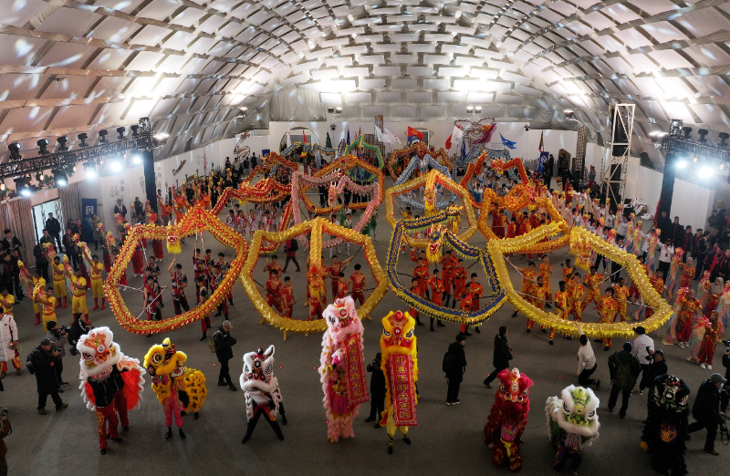10多条巨龙翻江倒海,百条彩带龙绚丽飞扬,南狮高桩炫技,场面壮观,既展现了神龙威武活泼的形态,又营造出喜庆吉祥的欢快氛围。观众踮高了脚,锣鼓声、喝彩声不绝于耳……(江萱 王靖宇)