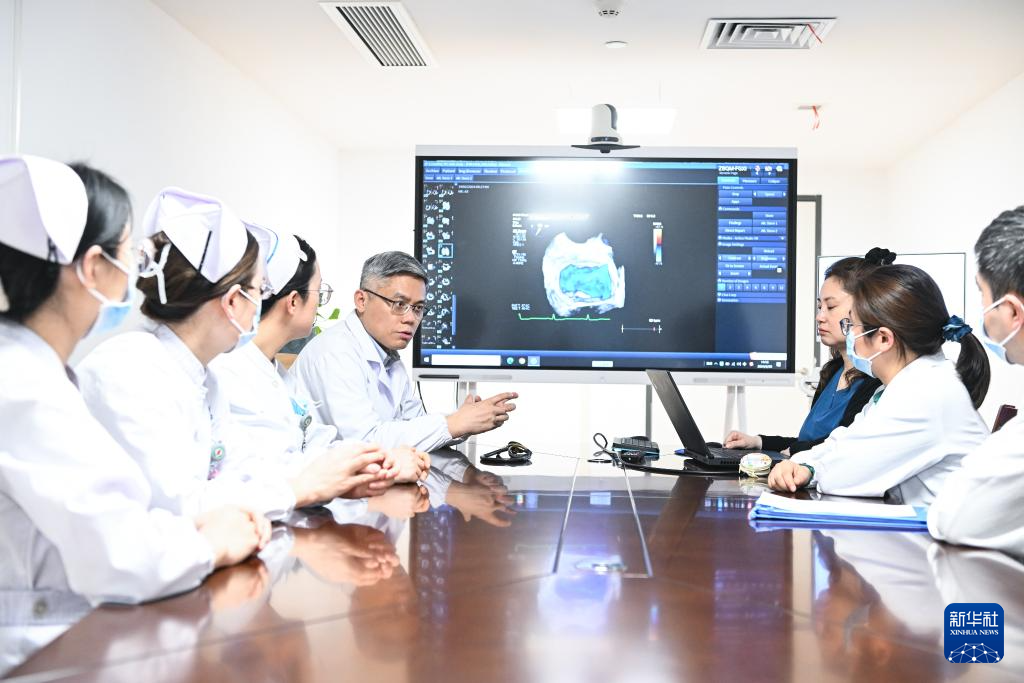 在南京市第一医院,张俊杰(右一)和同事进行业务研讨(2月20日摄)。