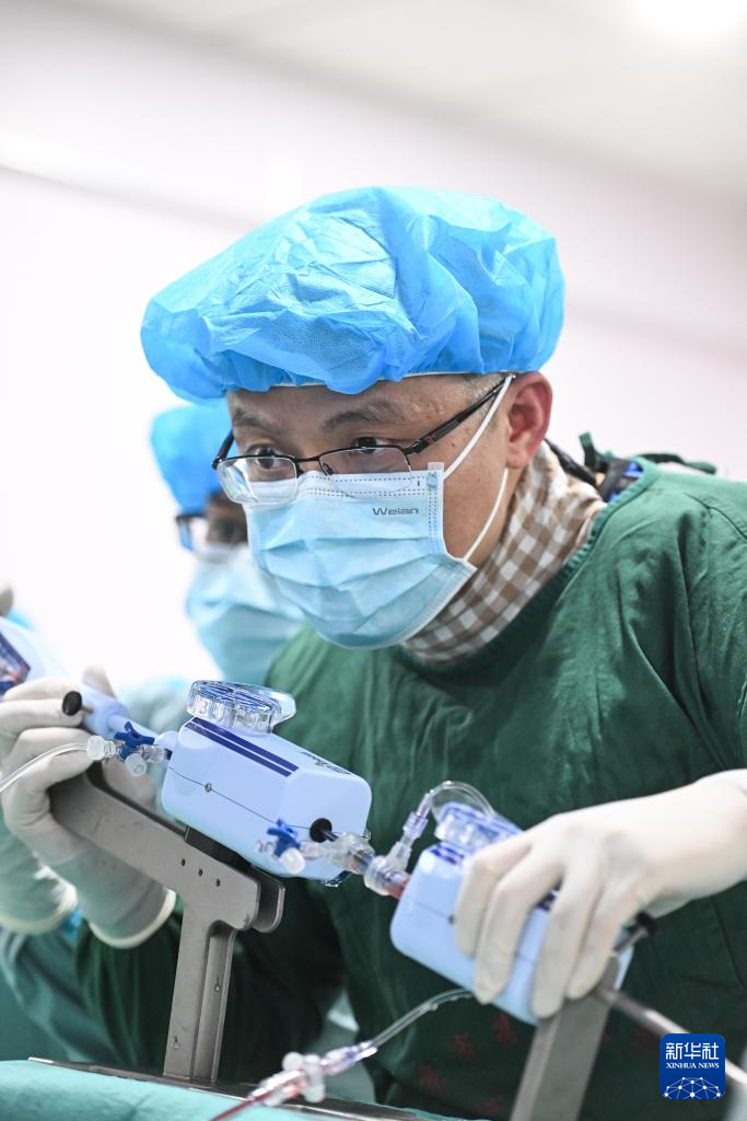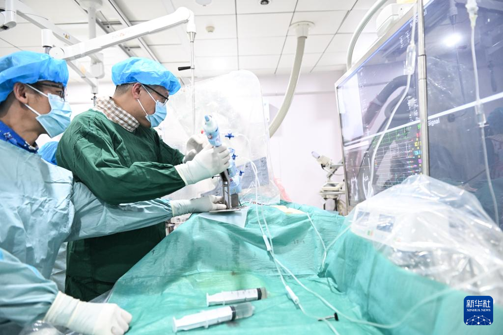 在南京市第一医院,张俊杰(右)和团队在心导管室为患者进行经导管二尖瓣缘对缘修复手术(2月20日摄)。
