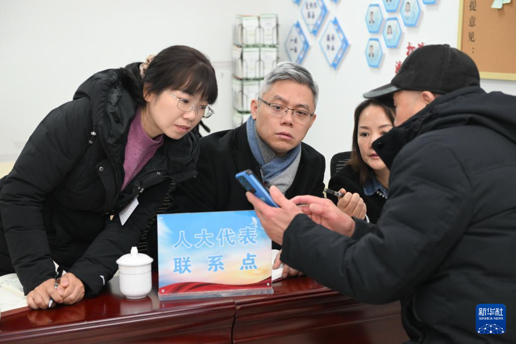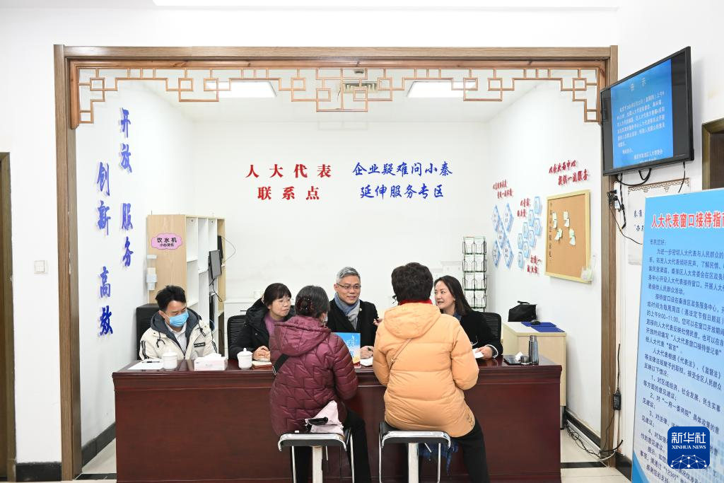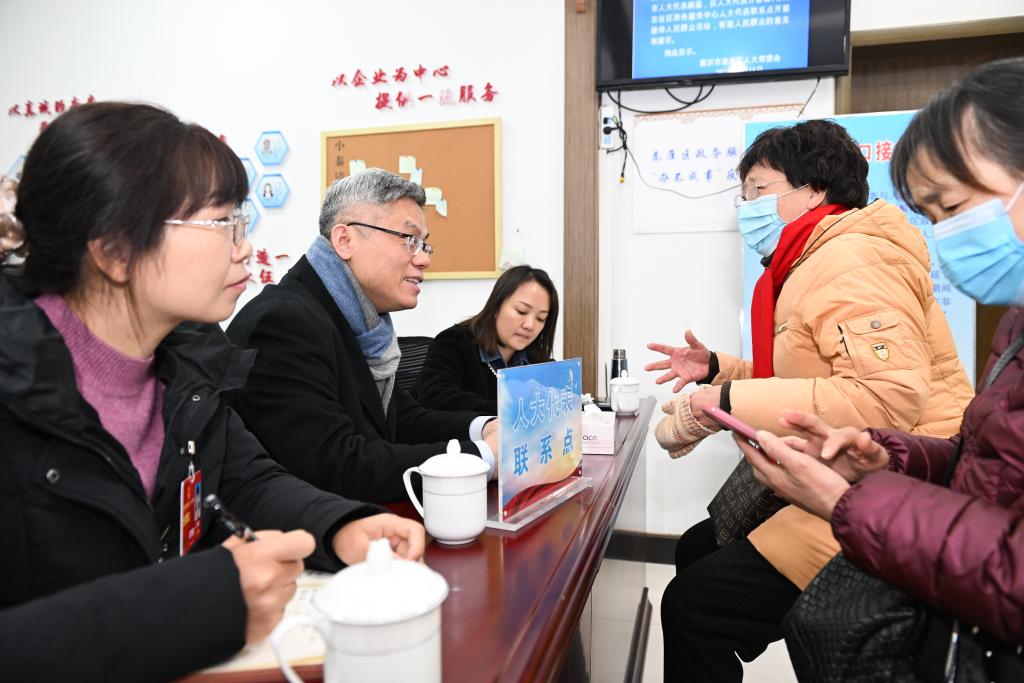 在南京市秦淮区政务服务中心内的人大代表联系点,张俊杰(左二)等听取民情(2月22日摄)。