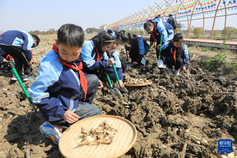 3月20日,孩子们在江阴市长泾镇蒲市村的农耕体验点参与挖茨菇体验活动。