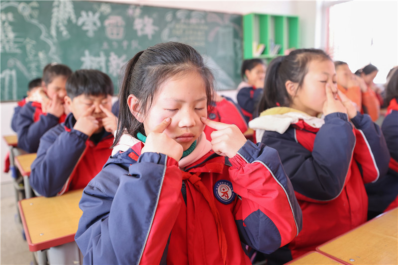 江苏省连云港市厉庄中心小学的学生在做眼保健操