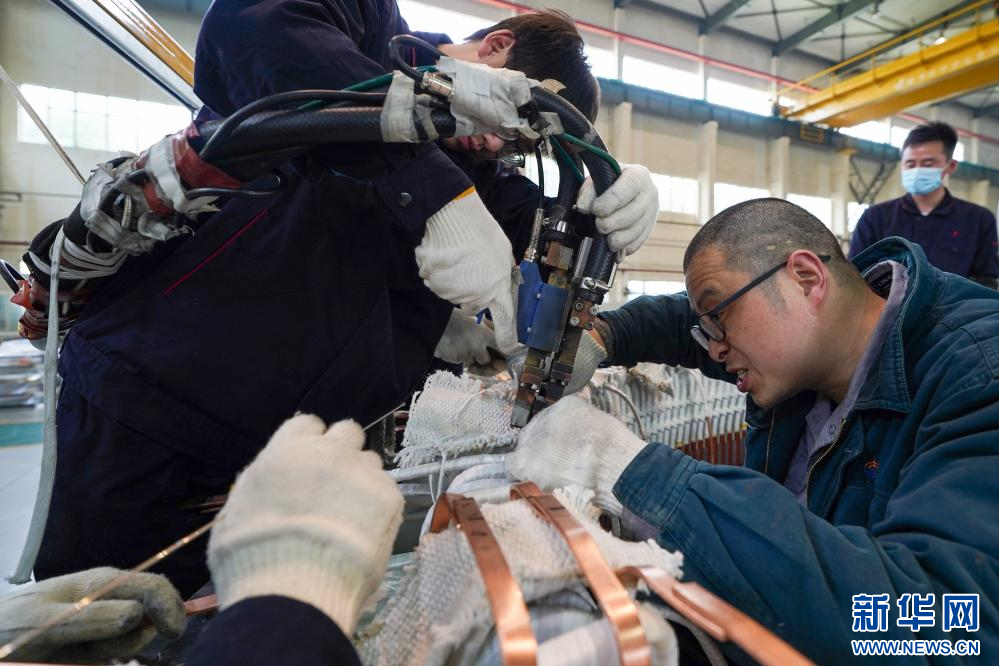 在南京江宁高新区南京汽轮电机长风新能源股份有限公司,工作人员正在加紧生产船用电机产品(3月28日摄)。