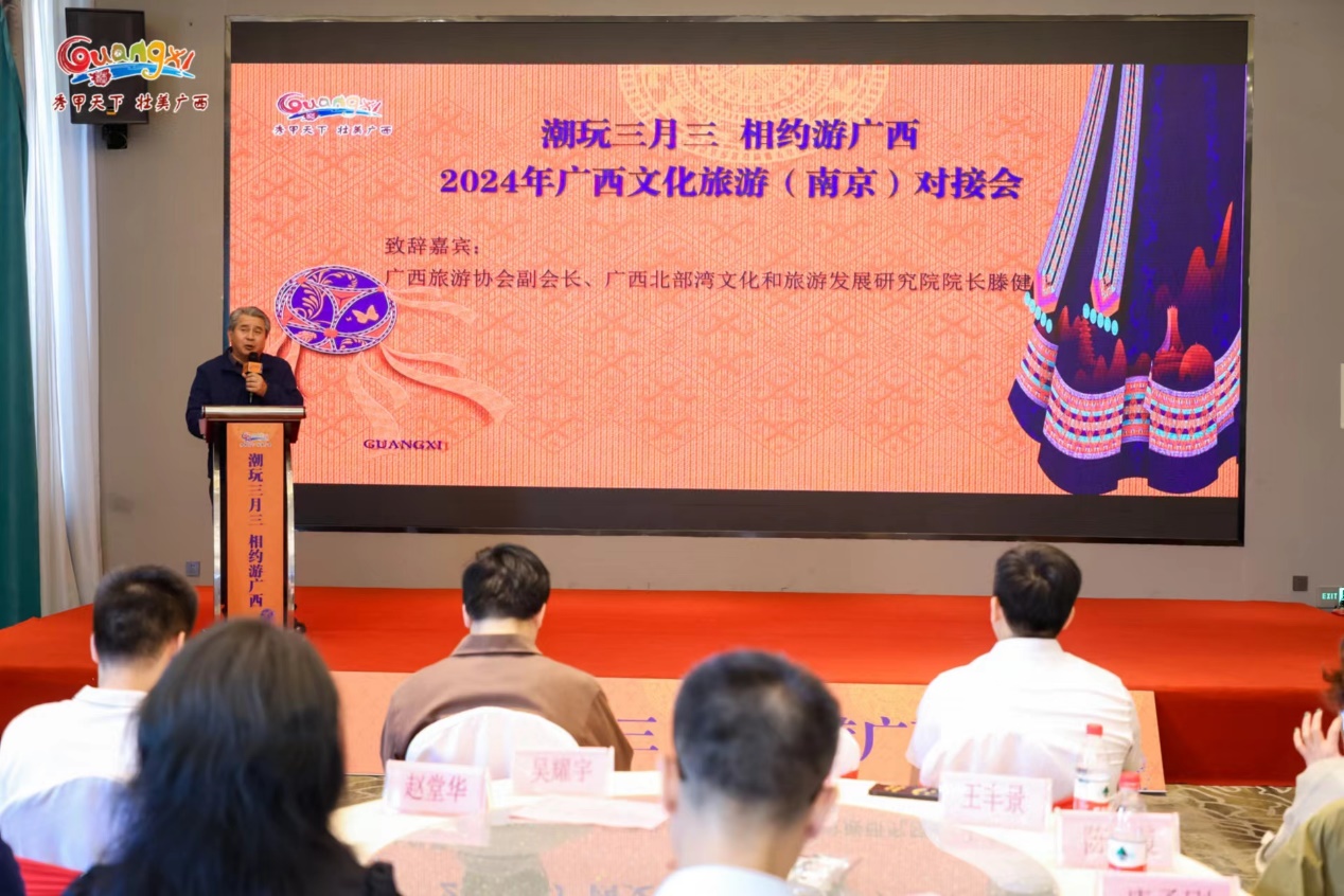 广西旅游协会副会长滕健在致辞中表示:广西和江苏两地旅游资源各有特色,一直以来都互为旅游目的地和客源地,多年以来,两省区旅游协会和旅游企业,都有着良好的合作关系,希望通过今天对接会,能促进两地旅游企业有更深、更广的合作,共同打造出适宜两地游客需求的旅游产品,为两地旅游市场经济增长的作出贡献。并诚挚邀请与会嘉宾,一起去感受广西“三月三”的狂欢,去游赏桂林山水的秀美;去感受北部湾滨海的浪漫;去寻觅千里边关、千里画廊的神奇,去探寻世界长寿之乡的养生秘诀;去尝遍西南地道的桂味美食。