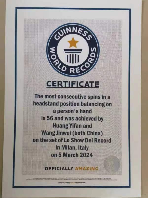 4月8日,意大利米兰电视台播出“吉尼斯世界纪录挑战赛”,江苏省射阳县杂技团演员黄逸凡、王金玮参赛的杂技《战友•双人技巧》凭借单手托举头顶30秒倒立旋转56圈,一举创下新的吉尼斯世界纪录。