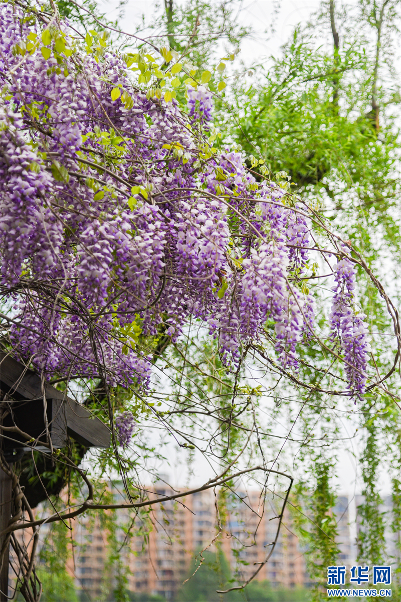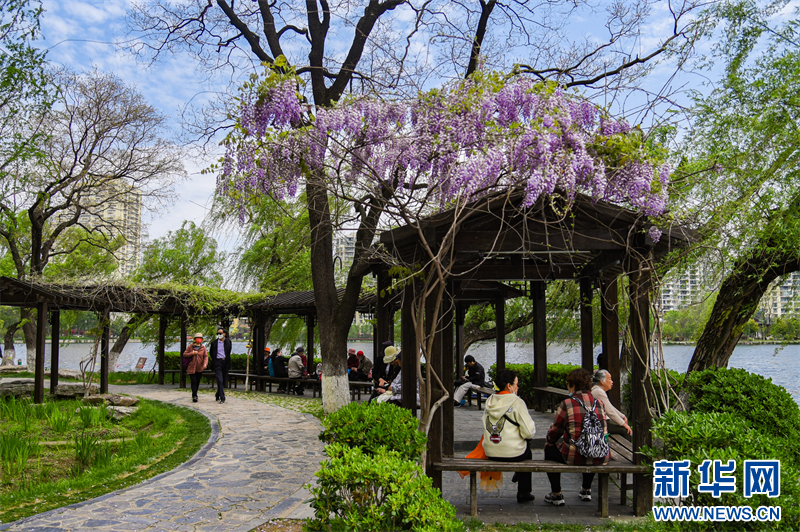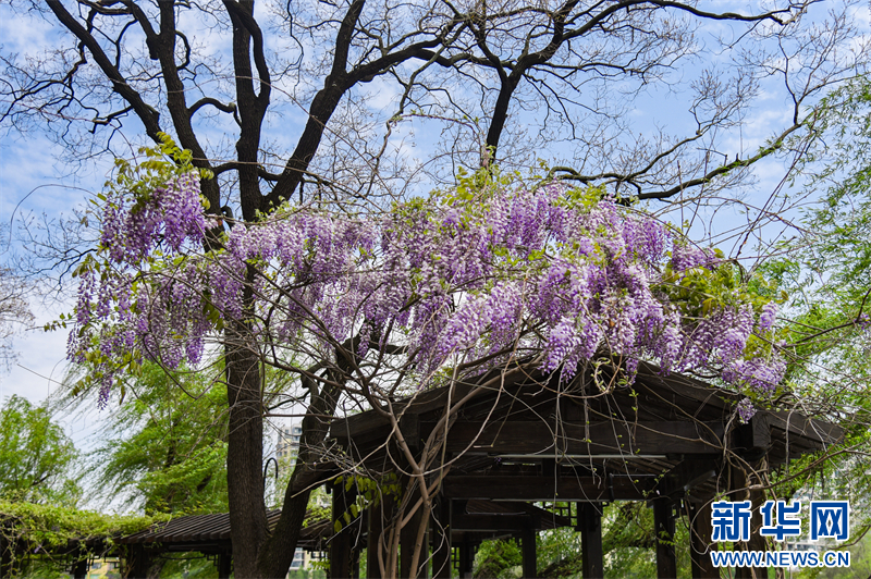 近日,南京莫愁湖景区内一株三百多年树龄的紫藤花迎来盛花期。远远望去,花开如瀑,带来春日限定浪漫。(沙佳仪 素材来源:南京莫愁湖景区)