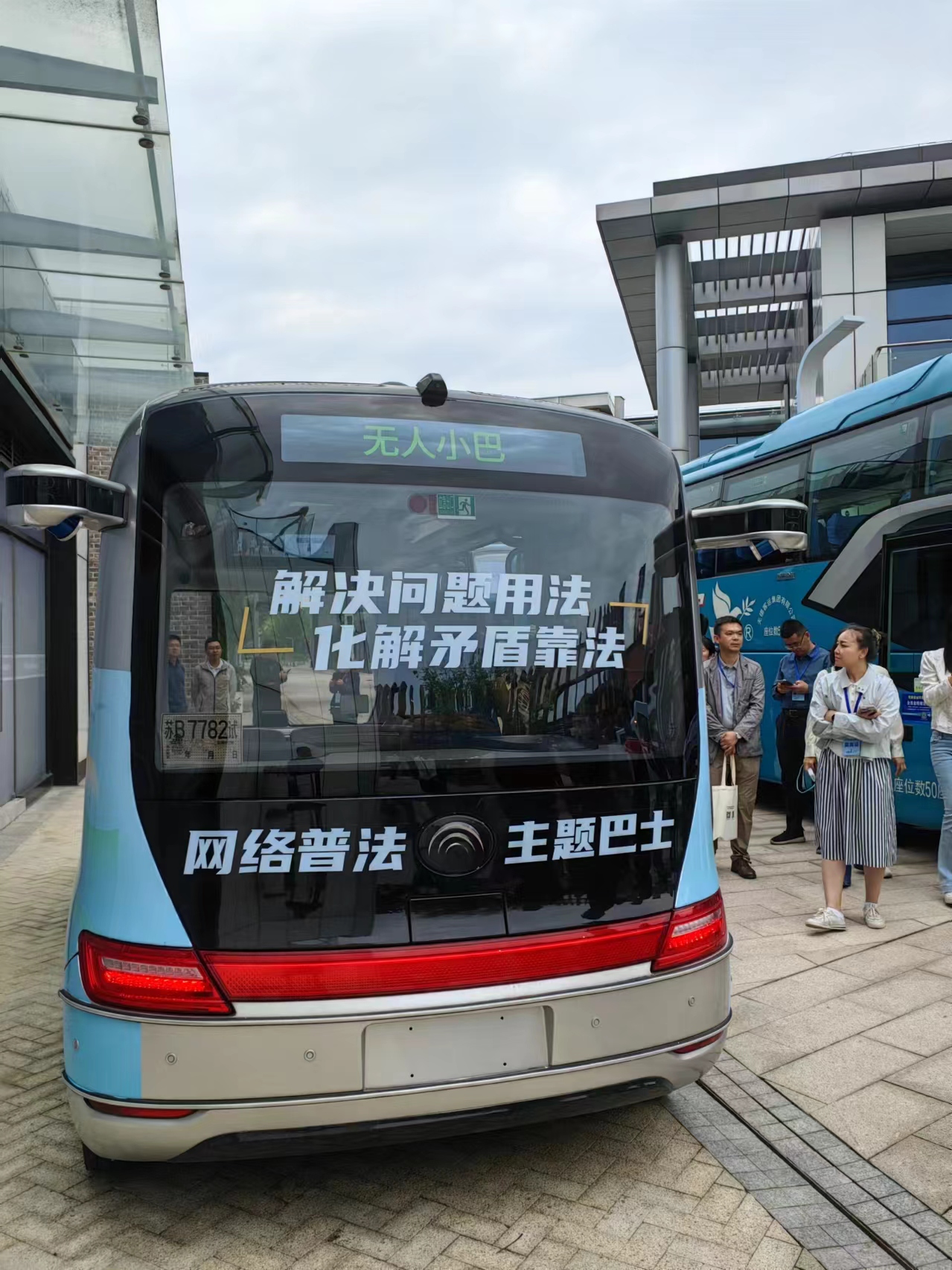 国家物联网先进制造业集群物联网创新展示中心,坐落在无锡市经济开发区雪浪小镇。刚进入小镇,一辆科技感十足的无人小巴士便吸引了众人目光。该车车身上印有“网络普法主题巴士”“解决问题用法,化解矛盾靠法”等字样,车厢里循环放映着各类普法宣传视频。“这是我们于2023年3月开通的无人小巴,目前已经开通10条线路,累计运载10万人次,乘客还可以戴上VR眼镜,选择网络普法案例沉浸式学习,乘车、学法两不误。”无锡经济开发区党群工作部余永辉介绍。