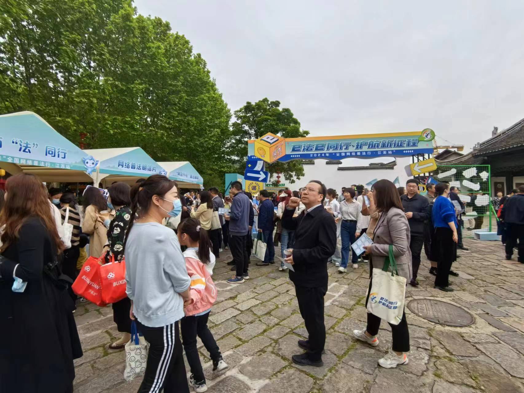4月25日,正值无锡市梁溪区惠山古镇杜鹃花节,人流量大、文化氛围浓,以“e法e同行·护航新征程”为主题的集中普法集市活动在此如火如荼地进行。在集市上,苏州的乔麦年画,徐州的马庄普法香包,无锡的泥人、锡绣、紫砂、锡剧等展示区域,也都将普法内容融入作品中;同时,市民还可以现场体验普法视力表、“普法”文创印章、“啡尝不可”普法咖啡、反诈杂货铺等互动项目。