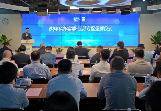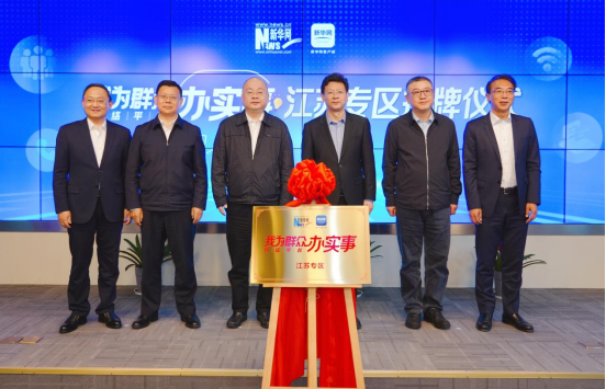 揭牌仪式环节,新华网首席运营官孙巍和新华网总裁助理、长三角中心主任、江苏公司总经理徐寿权共同为“我为群众办实事”网络平台江苏专区揭牌,储学军、刘亢、杨力群、胡建军等嘉宾共同见证揭牌。