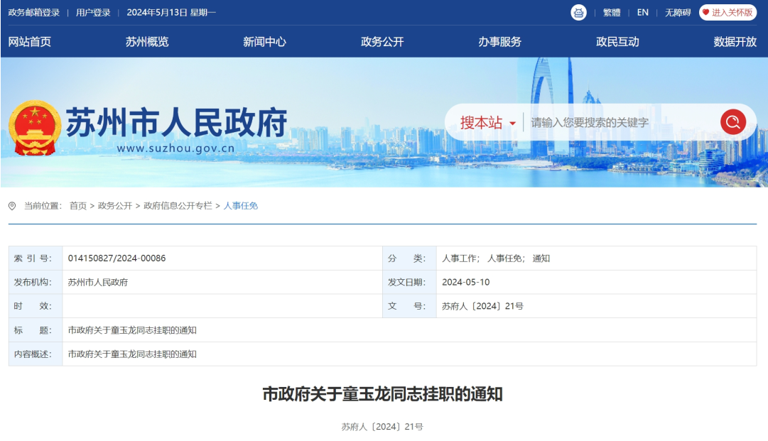 童玉龙同志挂职任苏州工业园区管委会副主任,时间一年。
