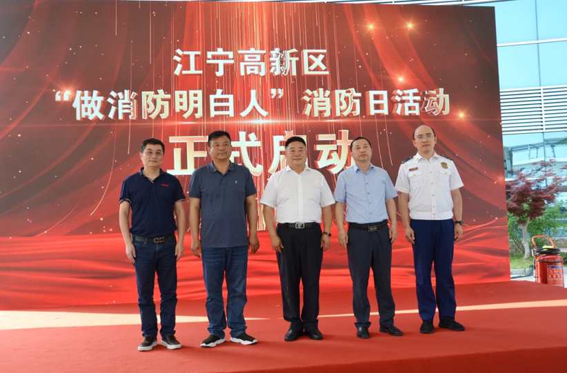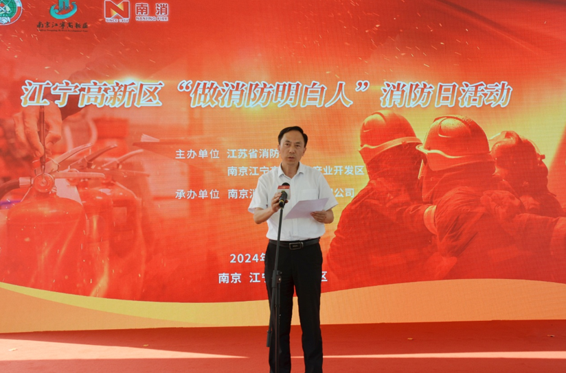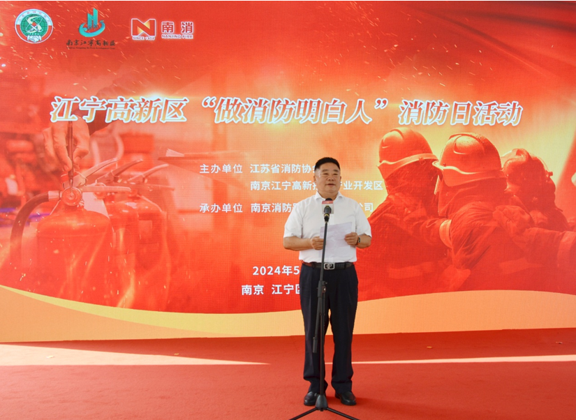 江苏省消防协会会长蒋正林、南京市江宁高新区管委会三级调研员王亚明出席主题日系列活动并致辞。省消防协会会长蒋正林,南京市江宁高新区党工委副书记、管委会主任刘广富,南京市江宁高新区管委会三级调研员王亚明,南京市江宁区消防救援大队副大队长钟鹏,江苏省科学传播中心科普产业部主任张龙,省消防协会副会长、南京消防器材股份有限公司董事长王以丹共同上台开启主题日活动。南京市江宁高新区政府、高新区部分企业、南京市江宁区消防救援大队、南京消防器材股份有限公司等单位300余人参加活动。