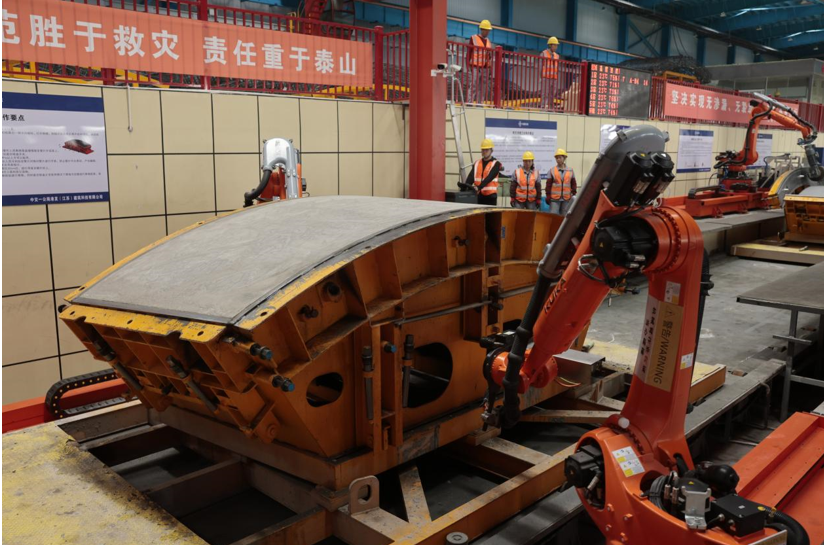 “以前生产管片这种预制构件,钢筋半成品加工全靠人工进行抓取码放,现在引入了全自动化钢筋加工设备,配置自动抓取码放系统,形成流水化作业减少人员30%。”中交一公局港发建科总工程师刘安介绍说,“我们引进了高位料仓设备、真空吸盘、自动化机器人、重型AGV小车等设备,自主研发第四代智能管片生产流水线,用机械臂代替人工,劳动强度减少20%,有效规避了我们传统生产模式的一些弊端。在保证关键技术应用及产品质量的同时,实现智能化装备率达90%以上,达到国内领先水平。”